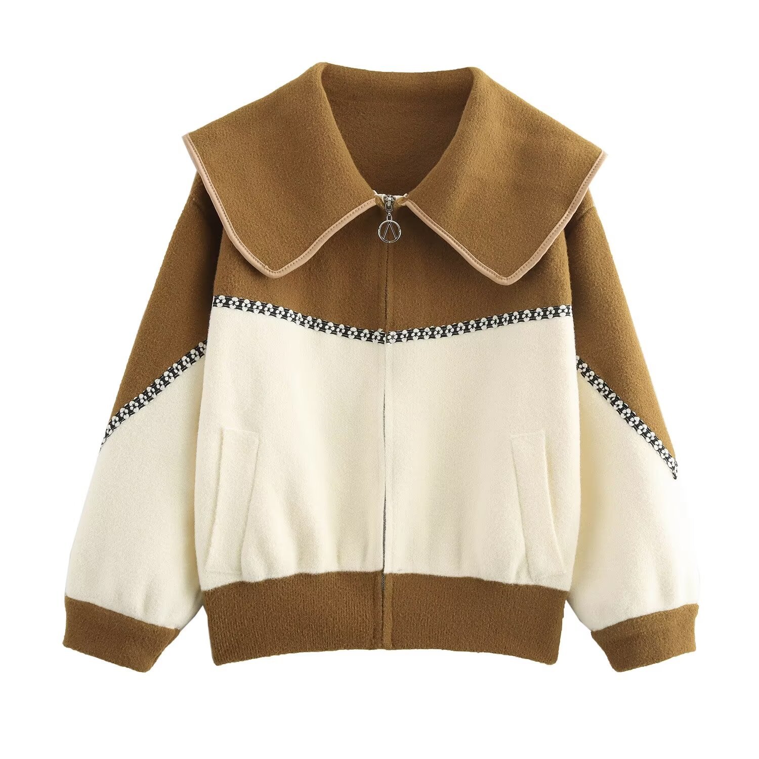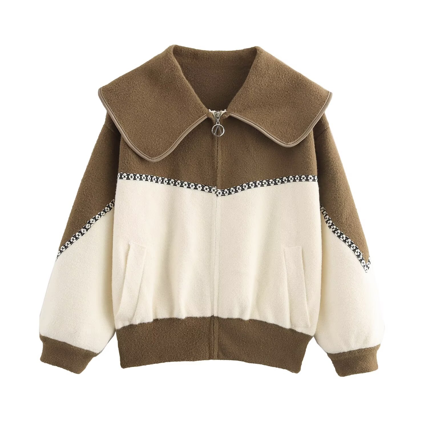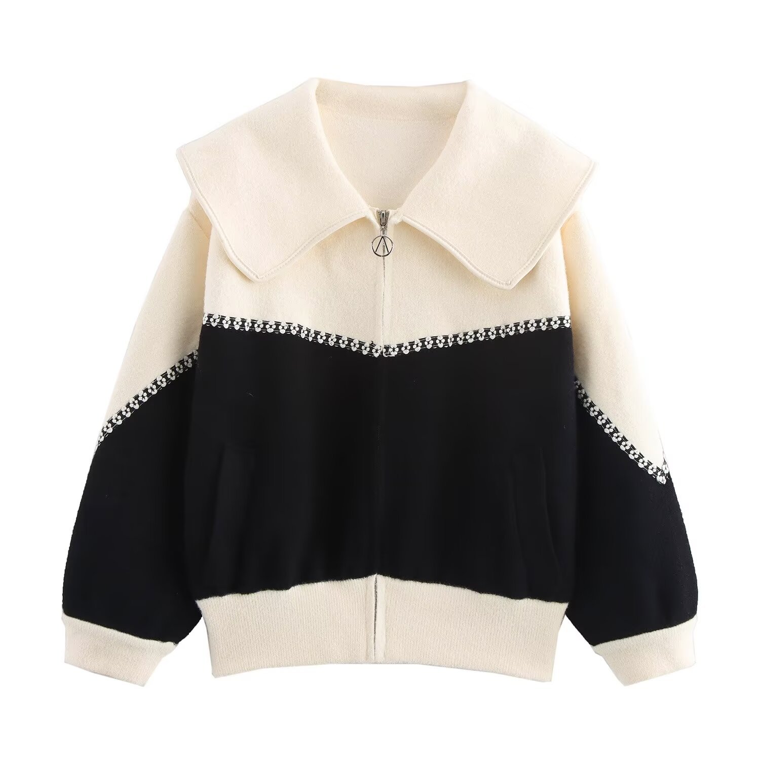 Color blocking collar zipper knitted double-sided cardigan design loose sweater jacket for women