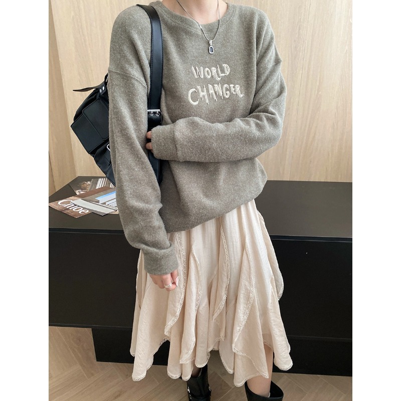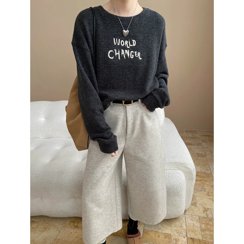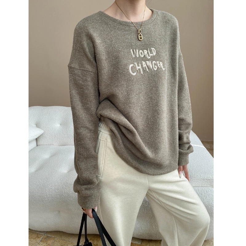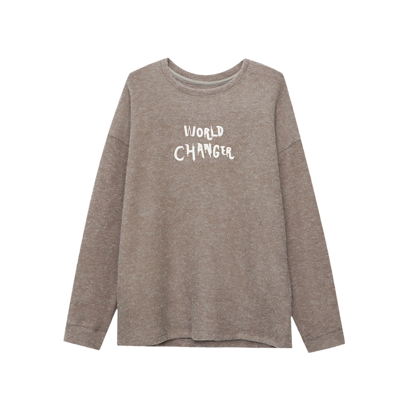 Comfortable Soft Brushed Crew Neck Letter Embroidery Loose Long Sleeve Tee Shirt